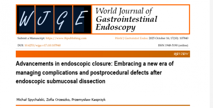 W najnowszym wydaniu World Journal of Gastrointestinal Endoscopy ukazał się mój artykuł dotyczący różnych sposobów zamykania ubytków po zabiegach endoskopowych. To nowa gałąź endoskopii zabiegowej. Odpowiednie zamykanie ubytków po ESD/EMR znacznie zwiększa bezpieczeństwo zabiegów. Techniakami tymi zajmuję się od lat, prowadzę również kursy z szycia endoskopowego wszystkimi dostępnymi metodami. Było mi bardzo miło przyjąć zaproszenie do napisania tego artykułu, w którym opisaliśmy szczegółowo nowoczesne metody zamykania ubytków.